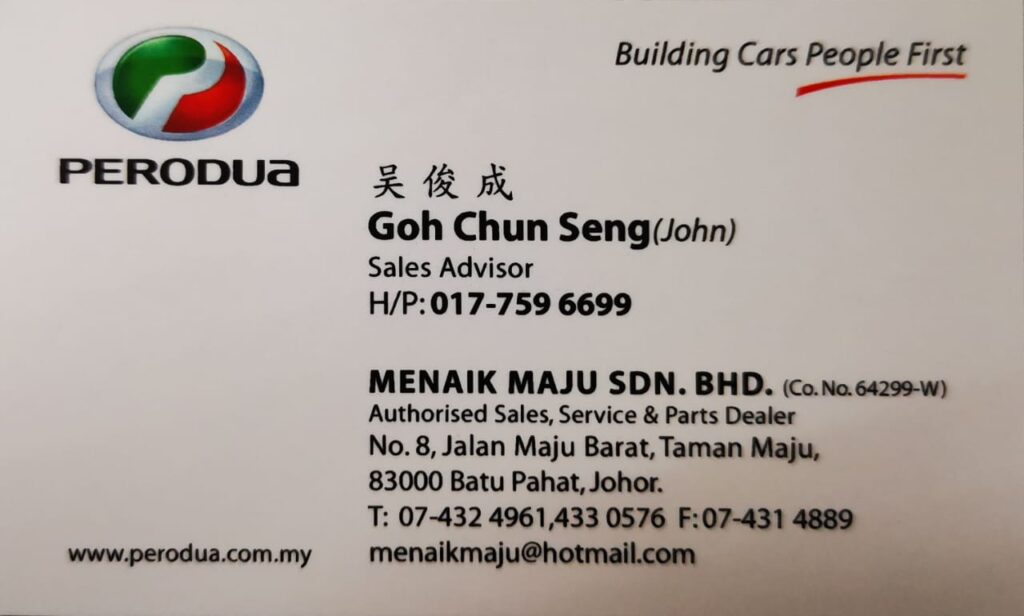 Hai! Nama saya John, Sales Advisor Perodua Batu Pahat yang sah. Berpengalaman lebih 13 tahun dalam bidang jualan kereta di Malaysia.